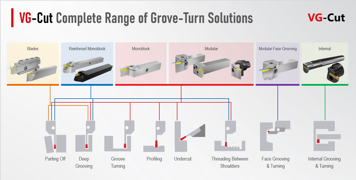 Parting Off, Turning, Profiling, Boring, Face Grooving and Threading. VG-Cut inserts also offer a variety of chip formers